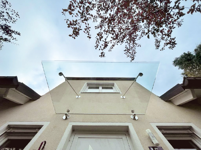Ein Vordach aus Glas schützt den Eingangsbereich vor Regen und Schnee, sorgt für eine helle und einladende Atmosphäre durch Lichtdurchlässigkeit und verbessert die Ästhetik des Gebäudes.