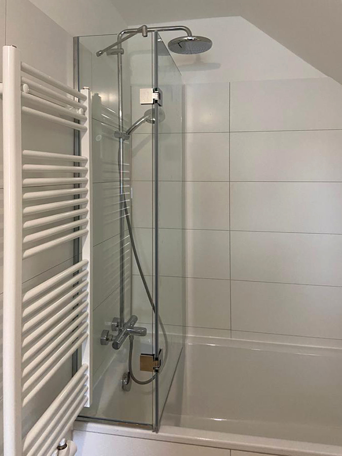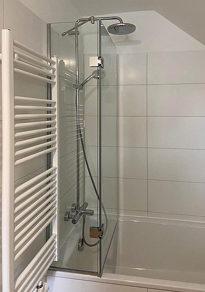Eine Badewanne muss sein, da sind sich viele Großstädter einig. Aber wie oft wünscht man sich nicht zugleich eine Duschkabine neben der Badewanne? Ist das Badezimmer zu klein für beides, lässt sich per Badewannenaufsatz aus Glas die Wanne mit einer Handbewegung in eine Duschkabine verwandeln. Diese Badewannen Duschabtrennung aus Glas wird bei Nichtgebrauch einfach zur Seite geklappt und als Faltwand platzsparend über den Rand der Badewanne geschwenkt. Damit kann man sich auch in einem Bad ohne extra Duschkabine nach Herzenslust dem Duschvergnügen hingeben, ohne sich Gedanken über Spritzwasser auf dem Fußboden oder den Wänden machen zu müssen.