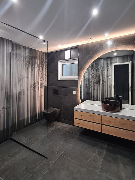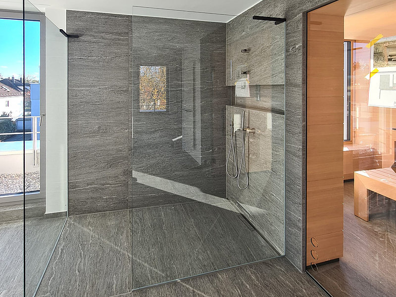 Eine Ganzglasdusche ist eine Duschkabine, bei der sowohl die Seitenwände als auch die Türen komplett aus Glas bestehen. Sie erzeugt eine transparente und offene Optik im Badezimmer.