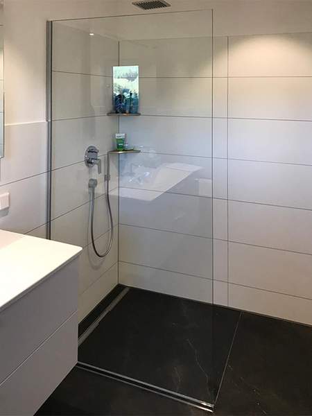 Unsere Produkte sind weitestgehend rahmenlos, transparent oder verfügen auf Wunsch über eine Struktur, sind satiniert, teilsatiniert oder farbig. Wir verwenden Sicherheitsglas, das mit Clear-Shield® oder Signapur® – einer UV-härtende Nanoversiegelung – beschichtet werden kann. Für Ihre Ganzglasdusche empfehlen wir Glasrückwände statt Fliesen, da diese sich besonders gut reinigen lassen. Es gibt sie auf Wunsch bedruckt oder lackiert.